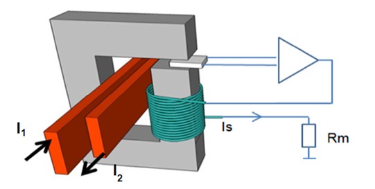 如图1所示,用于检测漏电流的霍尔闭环传感器在除了主导体(I1)之外还包含第二根主导体(I2)。两根导体中的电流差分(I1-I2)在磁芯气隙处产生的磁通量和由驱动电流通过二次侧补偿绕组产生的磁通量相互抵消已达到动态的磁通量平衡。