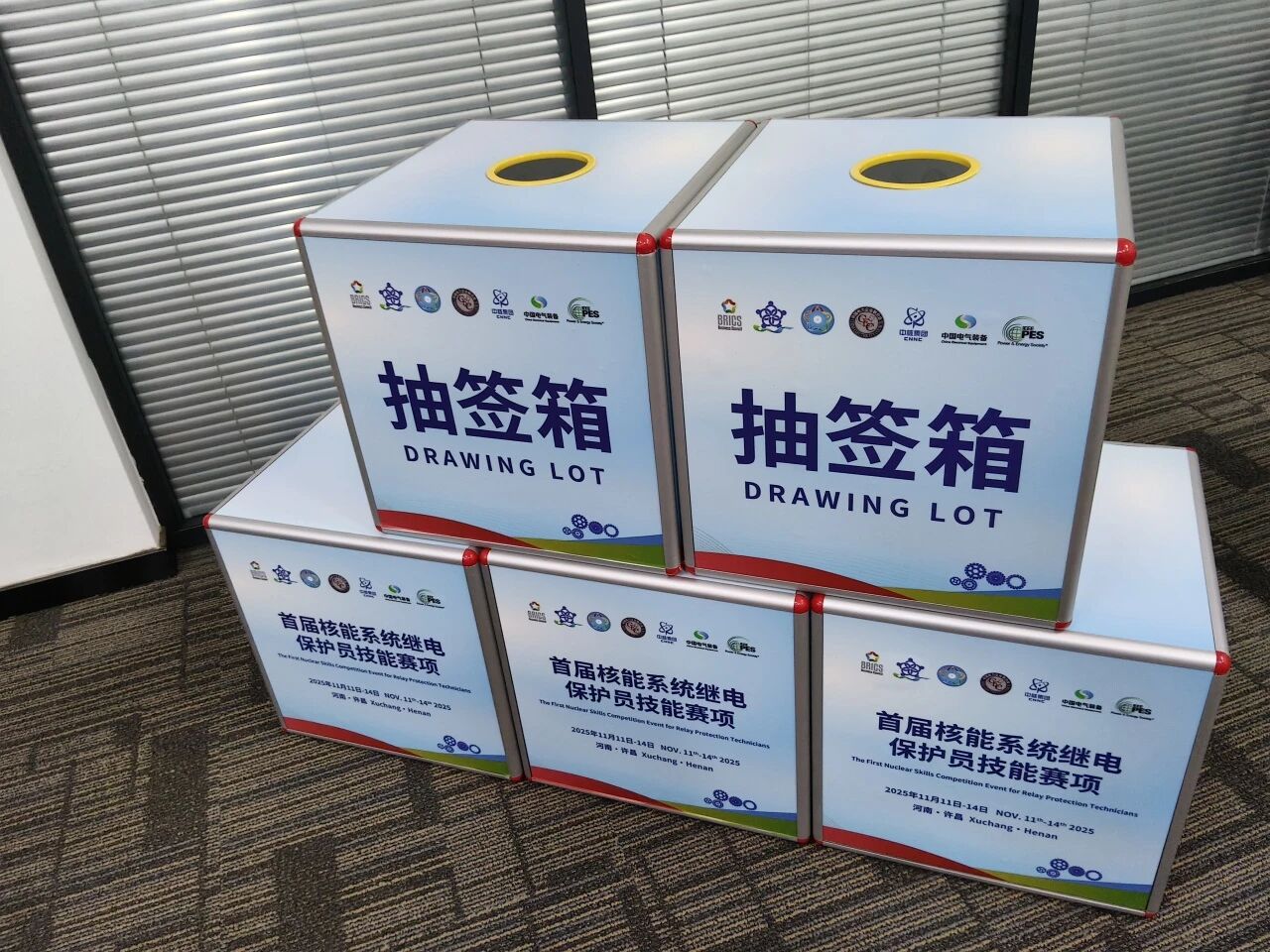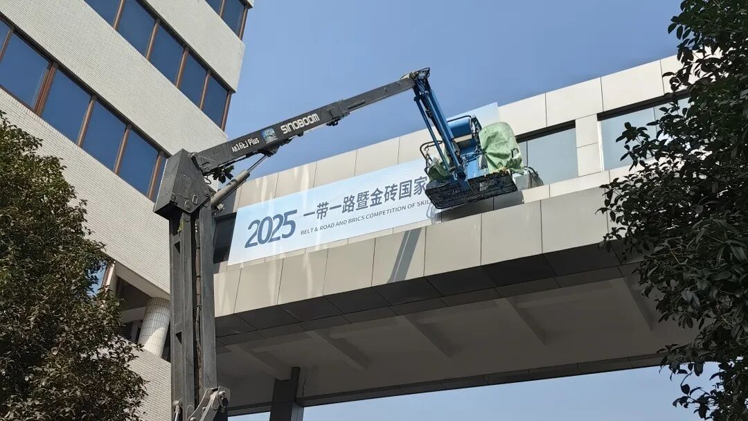l保护装置实操考场:场外精心布设设计感十足的DP打卡点、开阔舒展的高空赛事主题看板及引导道旗、楼梯贴,既强化赛事辨识度,又提升视觉吸引力。场内重点布置1300㎡金砖及参赛国国家吊旗,打造沉浸式国际赛事氛围,同步通过隔离桩划分国内外选手竞赛区域、84米围挡桁架保障场地规整,增设企业展区呈现行业前沿动态。搭配全场地清晰引导标识系统,在凸显国际赛事专业格调的同时,全方位筑牢场地安全与信息保密双重防线。
